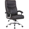 Cadeira giratória modelo Presidente. Braços fixos cromados com forração em couro ecológico. Base em aço cromado com rodízios de PU; regulagem de altura a gás com mecanismo relax. Assento e encosto moldados em concha única com uma fina camada de espuma, tipo esteirinha. Revestimento em couro ecológico com costuras horizontais disponível na cor preta.