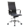 Cadeira giratória modelo secretária. Braços fixos cromados com forração em couro ecológico. Base em aço cromado com rodízios de PU; regulagem de altura a gás com mecanismo relax. Assento e encosto moldados em concha única com uma fina camada de espuma, tipo esteirinha. Revestimento em couro ecológico com costuras horizontais disponíveis nas cores Branca, Preta e caramelo.
