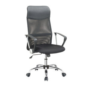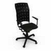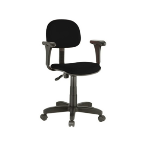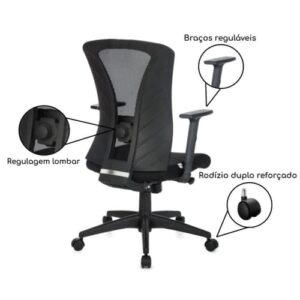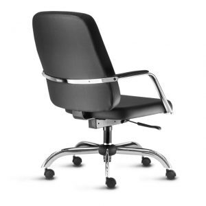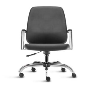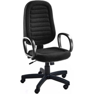 Poltrona de alta robustez, assento e encosto estruturados em compensado multilaminado de alta espessura, reforçados com elementos metálicos e estofados com espuma flexível de poliuretano, moldada, de alta densidade, alta resiliência e isenta de CFC. Braços e base em tubos de aço de secção elíptica, com acabamento cromado. Ajuste de altura do assento por meio de pistõ à Gás, conforme DIN 4550, Classe 04, com bucha de metal para reforço no curso. Rodízios de duplo giro injetados em poliamida, de alta performance.